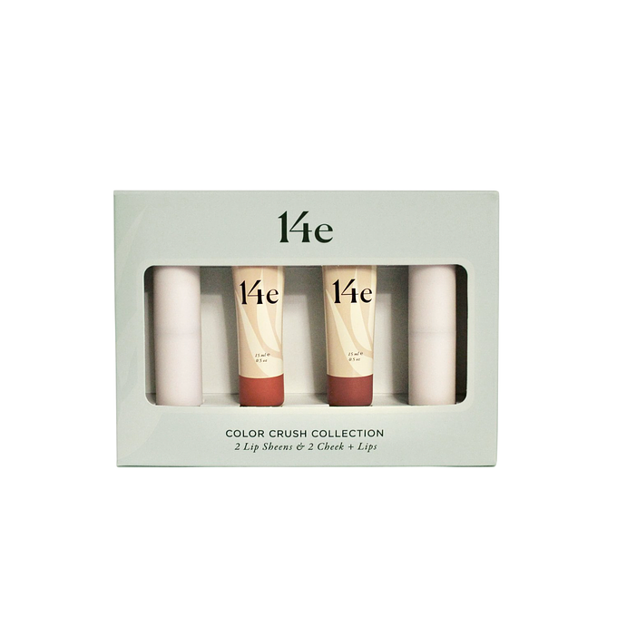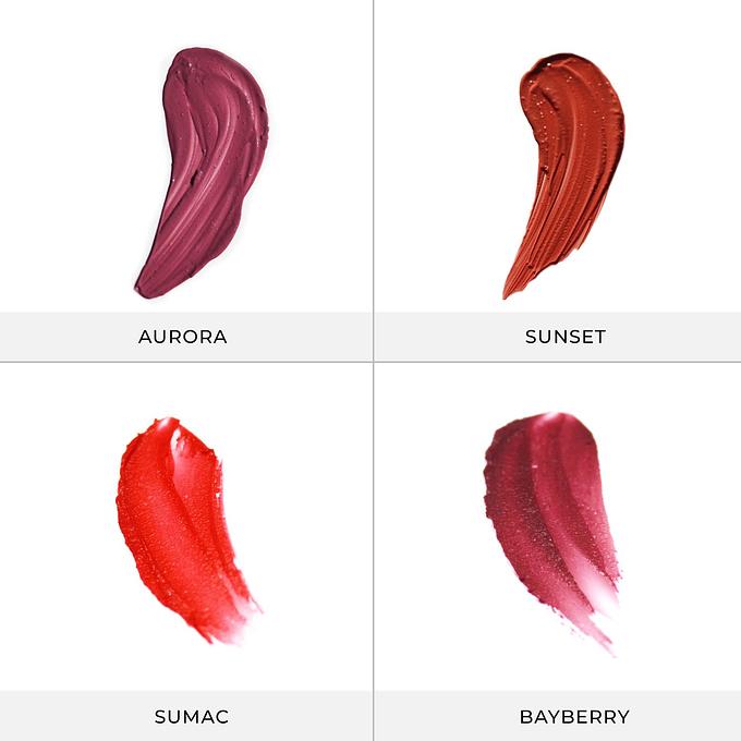 Our customers favorite shades all bundled up for you. Set includes: 2 Cheek + Lips in Sunset and Aurora, and 2 Lip Sheens in Bayberry and Sumac.