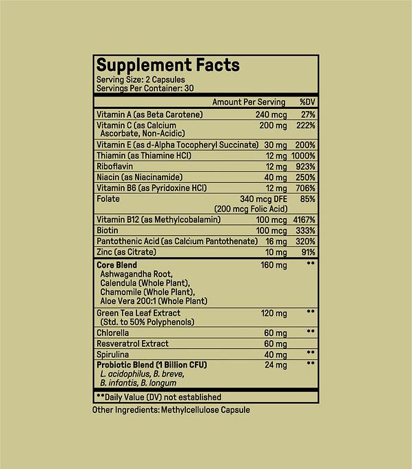 Vitamin A, Vitamin C, Vitamin E, Thiamine (Vitamin B1), Riboflavin (Vitamin B2), Niacin (Vitamin B3), Vitamin B6, Folate from Folic Acid (Vitamin B9), Vitamin B12, Biotin (Vitamin B7), Pantothenic Acid (Vitamin B5), Zinc, Ashwagandha Root, Calendula Extract, Chamomile Extract, Aloe Vera 200:1 Extract, Green Tea Leaf Extract, Chlorella, Resveratrol Extract, Spirulina, Lactobacillus Acidophilus, Bifidus Bifidum Breve, Bifidus Bifidum Infantis, Bifidus Bifidum Longum.