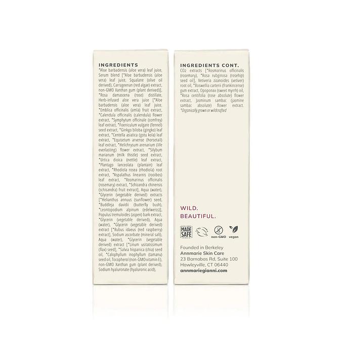 *Aloe barbadensis (aloe vera) leaf juice, Serum blend [*Aloe barbadensis (aloe vera) leaf juice, Squalane (olive oil derived), Carrageenan (red algae) extract, non-GMO Xanthan gum (plant derived)], *Rosa damascena (rose) distillate, Herb-infused aloe vera juice [*Aloe barbadensis (aloe vera) leaf juice, *Emblica officinalis (amla) fruit extract, *Calendula officinalis (calendula) flower extract, *Symphytum officinale (comfrey) leaf extract, *Foeniculum vulgare (fennel) seed extract, *Ginkgo biloba (gingko) leaf extract, *Centella asiatica (gotu kola) leaf extract, *Equisetum arvense (horsetail) leaf extract, *Helichrysum arenarium (life everlasting) flower extract, *Silybum marianum (milk thistle) seed extract, *Urtica dioica (nettle) leaf extract, *Plantago lanceolata (plantain) leaf extract, *Rhodiola rosea (rhodiola) root extract, *Aspalathus linearnis (rooibos) leaf extract, *Rosmarinus officinalis (rosemary) extract, *Schizandra chinensis (schisandra) fruit extract], Aqua (water), *Glycerin (vegetable derived) extracts [*Helianthus annuus (sunflower) seed, *Buddleja davidii (butterfly bush), *Leontopodium alpinum (edelweiss)], Populus tremuloides (aspen) bark extract, *Glycerin (vegetable derived), Aqua (water), *Glycerin (vegetable derived) extract [*Rubus idaeus (red raspberry) extract], Sodium ascorbate (mineral salt), Aqua (water), *Glycerin (vegetable derived) extract [*Linum usitatissimum (flax) seed], *Salvia hispanica (chia) seed oil, *Calophyllum inophyllum (tamanu) seed oil, Tocopherol (non-GMO vitamin E), non-GMO Xanthan gum (plant derived), Sodium hyaluronate (hyaluronic acid), CO2 extracts [*Rosmarinus officinalis (rosemary), *Rosa rubginosa (rosehip) seed oil], Vetiveria zizanoides (vetiver) root oil, *Boswellia carterii (frankincense) gum extract, Opoponax (sweet myrrh) oil, *Rosa centifolia (rose absolute) flower extract, Jasminum sambac (jasmine sambac absolute) flower extract. *Organically grown or wildcrafted