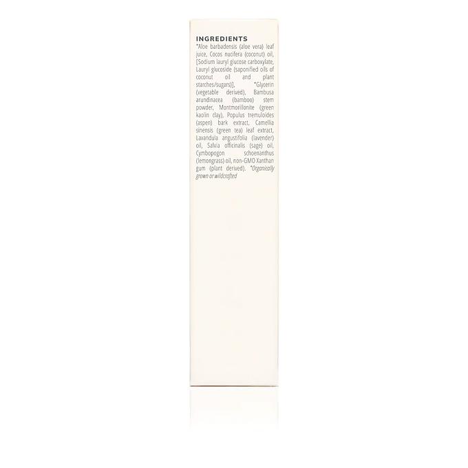 *Aloe barbadensis (aloe vera) leaf juice, Cocos nucifera (coconut) oil, [Sodium lauryl glucose carboxylate, Lauryl glucoside (saponified oils of coconut oil and plant starches/sugars)], *Glycerin (vegetable derived), Bambusa arundinacea (bamboo) stem powder, Montmorillonite (green kaolin clay), Populus tremuloides (aspen) bark extract, Camellia sinensis (green tea) leaf extract, Lavandula angustifolia (lavender) oil, Salvia officinalis (sage) oil, Cymbopogon schoenanthus (lemongrass) oil, non-GMO Xanthan gum (plant derived). *Organically grown or wildcrafted