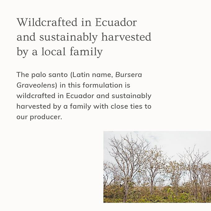 The palo santo (Latin name, Bursera Graveolens) in this formulation is wildcrafted in Ecuador and sustainably harvested solely from fallen trees and branches. We source specifically from a non-endangered species, not to be confused with Bulnesia Sarmientoi. Palo santo essential oil is extracted using vapor distillation, without the use of dangerous chemicals or solvents. This ensures a safe, eco-conscious approach without harming the land or destroying a single tree. We partner with a distributor who keeps a close relationship and connection to the family and with the local communities in Ecuador. They are committed to reforestation and giving back to the planet. Since 2008, our partner has planted over 30,000 trees back into the area and continues to support farmworkers with a fair wage. Their partnership has become a relationship that provides a lasting livelihood for the coastal communities who gather and steward this “Holy Wood” from South America.