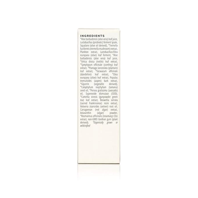 *Aloe barbadensis (aloe vera) leaf juice, Lactobacillus (probiotic) ferment lysate, Squalane (olive oil derived), *Tremella fuciformis (tremella mushroom) extract, Plankton extract, Lactobacillus/Olea europaea (olive) leaf ferment, *Aloe barbadensis (aloe vera) leaf juice, *Urtica dioica (nettle) leaf extract, *Symphytum officinale (comfrey) leaf extract, *Plantago lanceolata (plantain) leaf extract, *Taraxacum officinale (dandelion) leaf extract, *Olea europaea (olive) leaf extract, Populus tremuloides (aspen) bark extract, *Glycerin (vegetable derived), *Calophyllum inophyllum (tamanu) seed oil, *Persea gratissima (avocado) oil, Superoxide dismutase (SOD), *Camellia sinesis (gunpowder green tea) leaf extract, Boswellia serrata (sacred frankincense) resin extract, Vetiveria zizanoides (vetiver) root oil, Carrageenan (red algae) extract, Astaxanthin (algae) powder, *Rosmarinus officinalis (rosemary) CO2 extract, non-GMO Xanthan gum (plant derived). *Organically grown or wildcrafted
