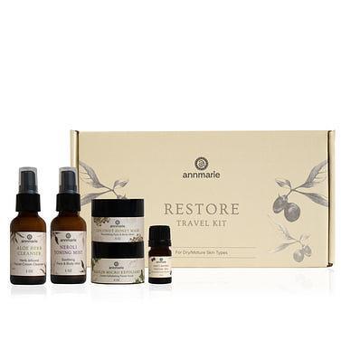 This five-piece, Restore Travel Kit is a two week supply that delivers restorative benefits to dry and mature skin, helping to smooth the appearance of fine lines and wrinkles with consistent use. Our Aloe Herb Cleanser, Kaolin Micro Exfoliant, Coconut Honey Mask, Neroli Toning Mist, and Anti-Aging Facial Oil work together to leave your skin beautifully radiant.