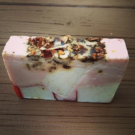 Soap Bar is topped with Real Rose Petals Color comes from Natural Earth Clays