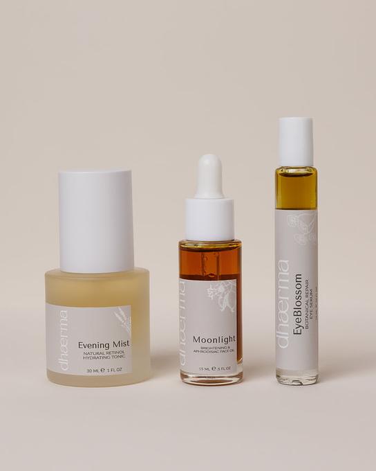 This trio creates a simple yet complete nighttime routine to keep your skin nourished. The calming lavender scent of the mist helps your mind unwind and relax, while the Moonlight Face Oil works overnight to target hyperpigmentation. Finally, our Eye Serum focuses on reducing fine lines, ensuring you wake up refreshed and rejuvenated. (Pss Eye creams are not recommended at night time since they actually make you wake up with puffy eyes)