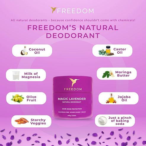 Natural Ingredients: The organic deodorant is made with Coconut oil, magnesium, moringa butter, jojoba oil, arrowroot powder (for sweat), olive fruit, milk of magnesia, starchy veggies, and a pinch of baking soda.