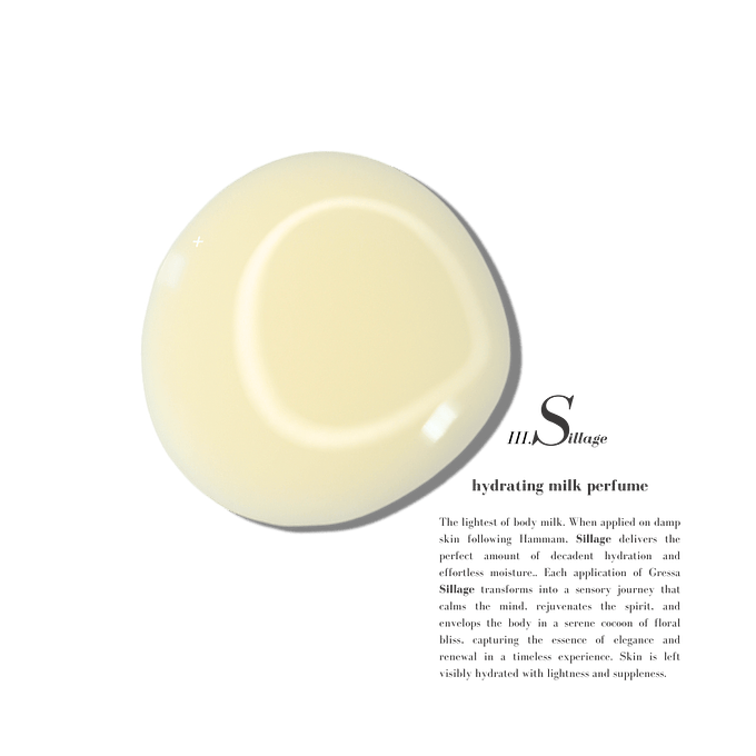 The lightest of body milk. When applied on damp skin following Hammam, Sillage delivers the perfect amount of decadent hydration and effortless moisture.. Each application of Gressa Sillage transforms into a sensory journey that calms the mind, rejuvenates the spirit, and envelops the body in a serene cocoon of floral bliss, capturing the essence of elegance and renewal in a timeless experience. Skin is left visibly hydrated with lightness and suppleness.