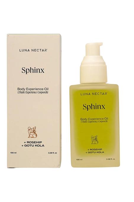 Oil-dripping, goddess vibes. Sphinx is a body and bath oil that goes on luxuriously rich, yet feels lightweight, absorbing quickly and leaving a protective, illuminating dewy finish.