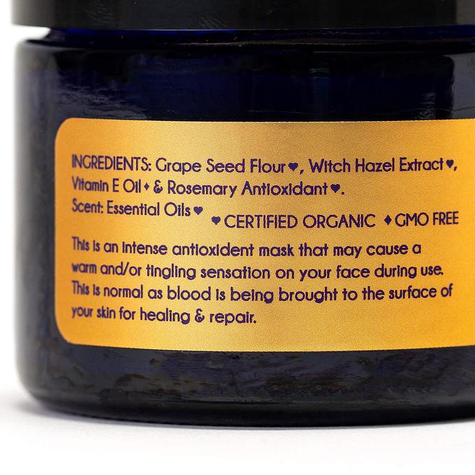 Grape Seed Flour: Extremely high in antioxidants (55,000 orac value) - activates your skin to pull toxins to the surface - will feel warm and quite tingly for the first few minutes until it begins to dry