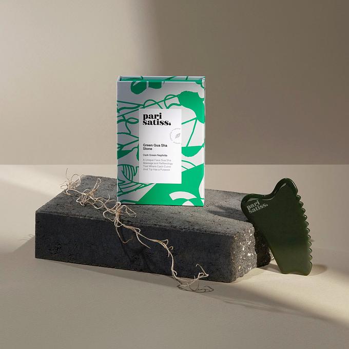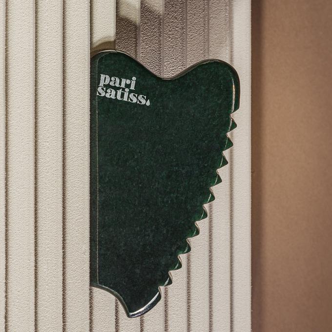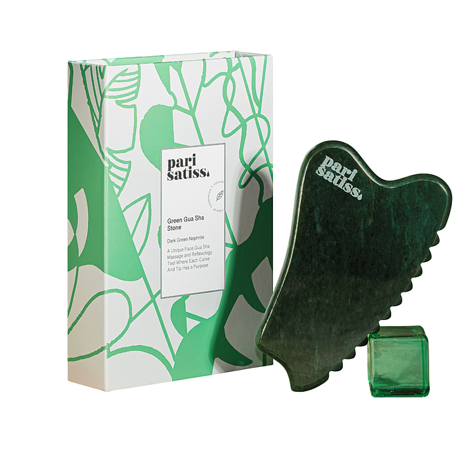 Pari Satiss Green Gua Sha Stone is made from nephrite jade, famous for its healing properties. Nephrite, traditional to Chinese culture, is a very dense and heavier stone, one of the most precious stones to be carved into a Gua Sha tool. According to Chinese culture, Nephrite is believed to bring calmness and balance, help bring positivity, mental strength and wellness, clear the mind of unnecessary thoughts and grievances.