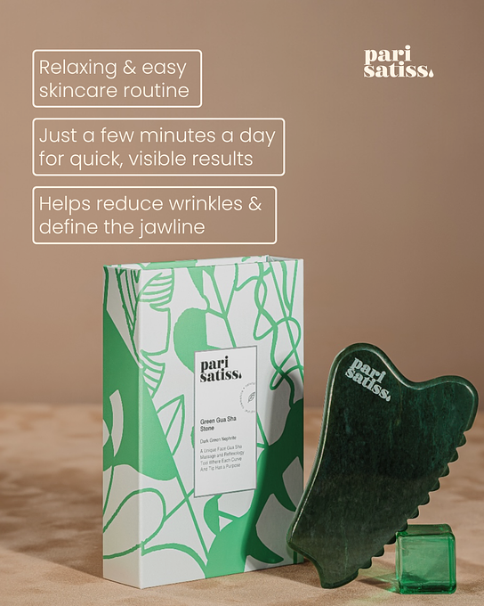 Pari Satiss Three Step Gua Sha Ritual has everything you need to start your gua sha wellness journey, and the great value deal for sets, save up to 20%. Two Pari Satiss skincare staples to help your stone gliding and a patented, thought-through gua sha stone. The stone featured in our gua sha ritual set was designed by our founder, Natalia. After working with thousands of faces and publishing a book on the gua sha massage technique, Natalia designed Pari Satiss Gua Sha contour to have a specific use for every curve and tip. With regular gua sha massage, you will notice these key effects: