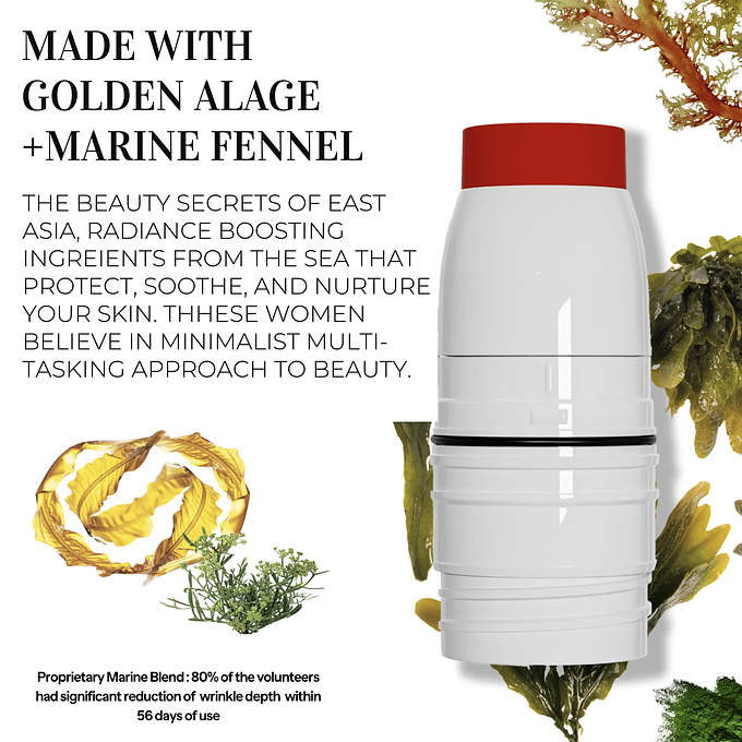 Inspired by the timeless beauty secrets of East Asia, our formula is enriched with golden seaweed and sea fennel algae, renowned for their nourishing properties. Not only does it give you a pop of color, but it also cares for your skin, leaving it feeling refreshed and radiant with each application.
