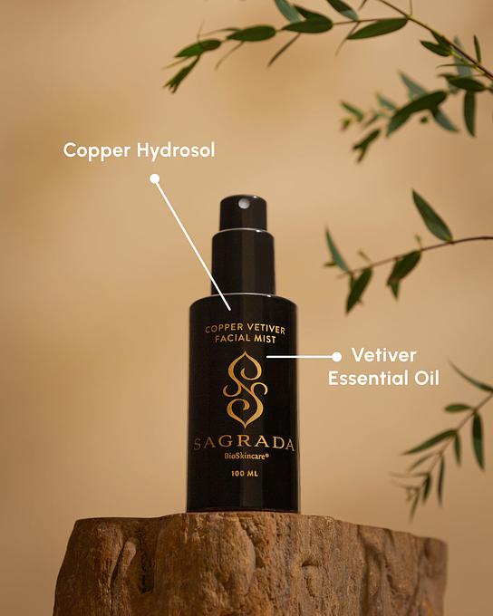 Experience the transformative power of our Copper Vetiver Face Mist. Infused with vetiver's grounding aroma and copper's unique properties, this toner helps rejuvenate your skin at a cellular level. Our process combines ancient wisdom with modern technology, ensuring each spritz delivers purity and effectiveness.