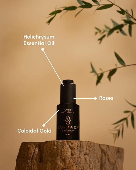 Our Gold Day Serum deeply nourishes and revitalizes dry skin, transforming it with lasting hydration and a supple texture.