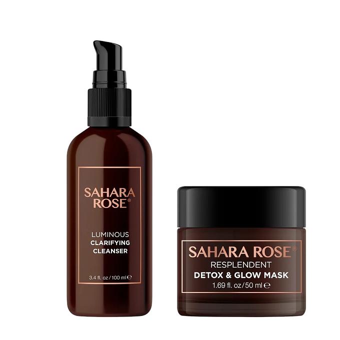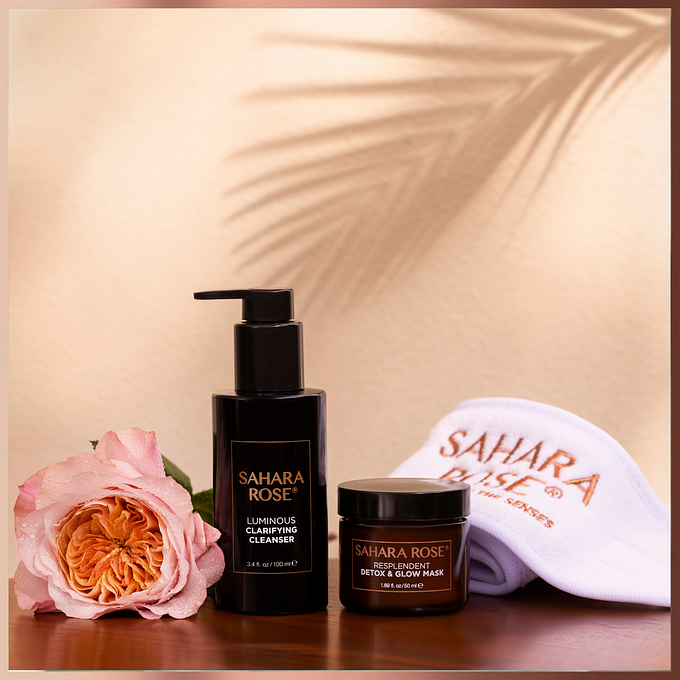 Unveil your radiant beauty with this 5-minute Skin Brightening Facial Set, a beloved addition to the SAHARA ROSE collection, which includes our Luminous Cleanser, Resplendent Enzyme Mask, and a spa grade headband. While the Luminous Cleanser and Resplendent Mask are potent on their own, when used in combination, they create a dynamic skincare duo. Experience the magic of our new 5 Minute Facial Set for an instant, luminous complexion.