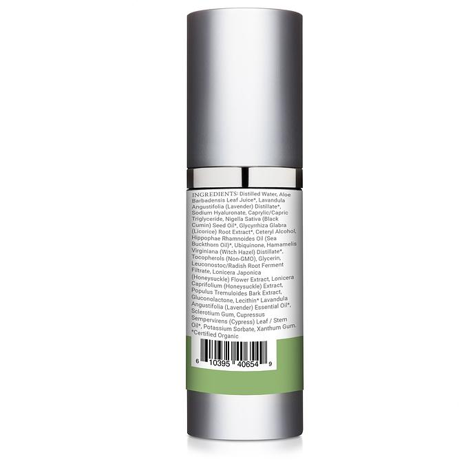 Ingredients: Distilled Water, Aloe Barbadensis Leaf Juice*, Lavandula Angustifolia (Lavender) Distillate*, Sodium Hyaluronate, Caprylic/Capric Triglyceride*, Nigella sativa (Black Cumin) Seed Oil*. Glycyrrhiza Glabra (Licorice) Root Extract*, Ceteryl Alchohol, Hippophae Rhamnoides Oil (Sea Buckthorn Oil)*, CoQ10, Hamamelis Virginiana (Witch Hazel) Distillate*, Tocopherols, Glycerin, Leuconostoc/Radish Root Ferment Filtrate, Lonicera Japonica (Honeysuckle) Flower Extract, Lonicera Caprifolium (Honeysuckle) Extract, Populus Tremuloides Bark Extract, Gluconolactone, Lecithin* Lavandula Angustifolia (Lavender) Essential Oil*, Sclerotium Gum, Potassium Sorbate, Xanthan Gum,
