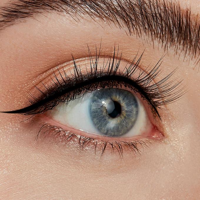 Apply your favorite Wicked Eyeliner and a light coat of Sinuosity Lash Mascara. Then, gently pick up your false lashes with the dual-ended Lash Applicator, starting at the inner corner. Hold the lashes up to your eye to measure and trim them if needed. Apply your favorite false eyelash glue to the lash band and wait 30 seconds before applying. Then, holding your false eyelashes at the center, press them onto the center of your upper lashline to align. Press in place with the applicator to secure them. Using the other side of the dual-ended Lash Applicator, comb through your eyelashes to seamlessly blend and remove any clumps. Finish your look by applying a coat of Sinuosity Lash Mascara with the E04 Lash Fan Brush.