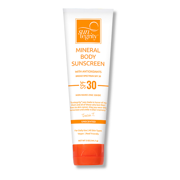 Suntegrity's Unscented Body SPF 30 Mineral Sunscreen provides safe, effective sun protection for the whole family, including babies, kids, and adults sensitive to fragrances. This dermatologist-approved, non-greasy formula features 20% non-nano, uncoated zinc oxide to offer broad-spectrum defense against harmful UVA and UVB rays. Recommended for all ages including children 6 months and up.
