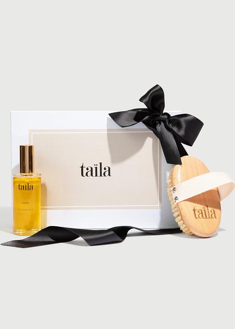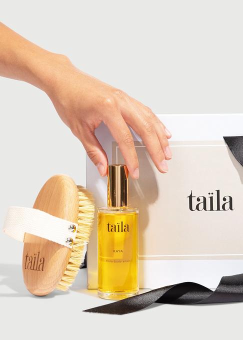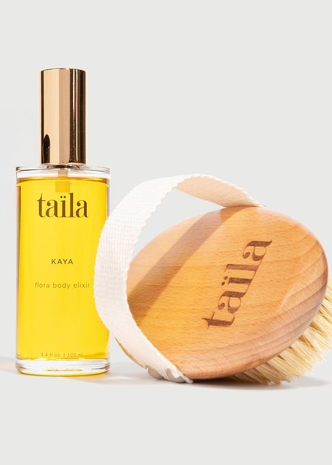 Discover the ultimate Ayurvedic skincare experience with our luxurious 2-step body ritual. This transformative routine instantly revives and nourishes your skin. Begin with our custom bamboo wood and vegan sisal dry body brush to boost blood circulation and lymphatic flow, effectively detoxifying your body. Then, indulge in our best-selling KAYA flora body oil elixir, formulated to deeply hydrate and infuse your skin with essential nutrients. Reveal radiant, spa-level skin at home with this holistic beauty ritual. Perfect as a thoughtful gift for a loved one.